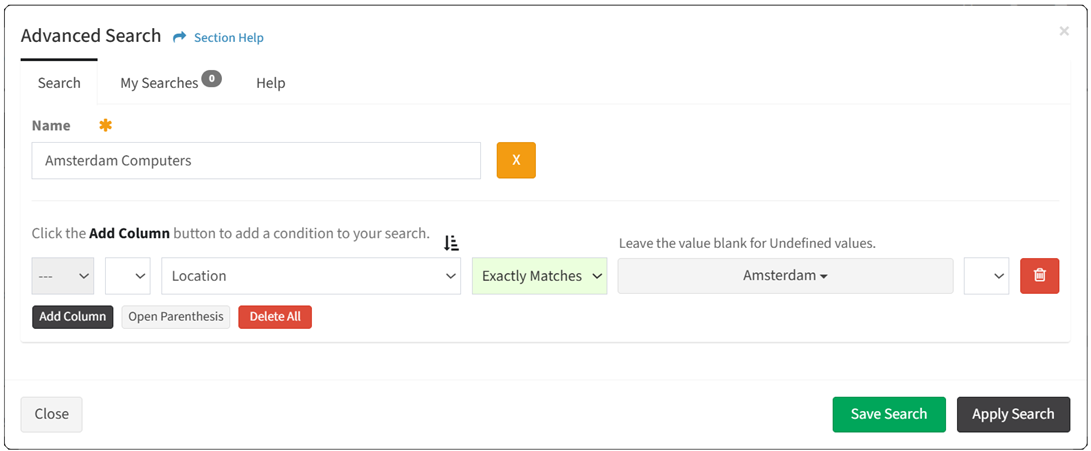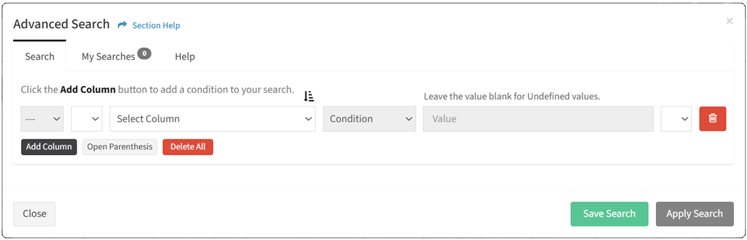 NOTE: Leave the value blank for Undefined values. - Click the Add Column button to add additional conditions to your search