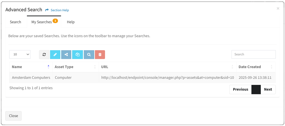 - Click the Save Search button to save your changes. You will be redirected back to the My Searches tab. Click the Close button to cancel the operation.