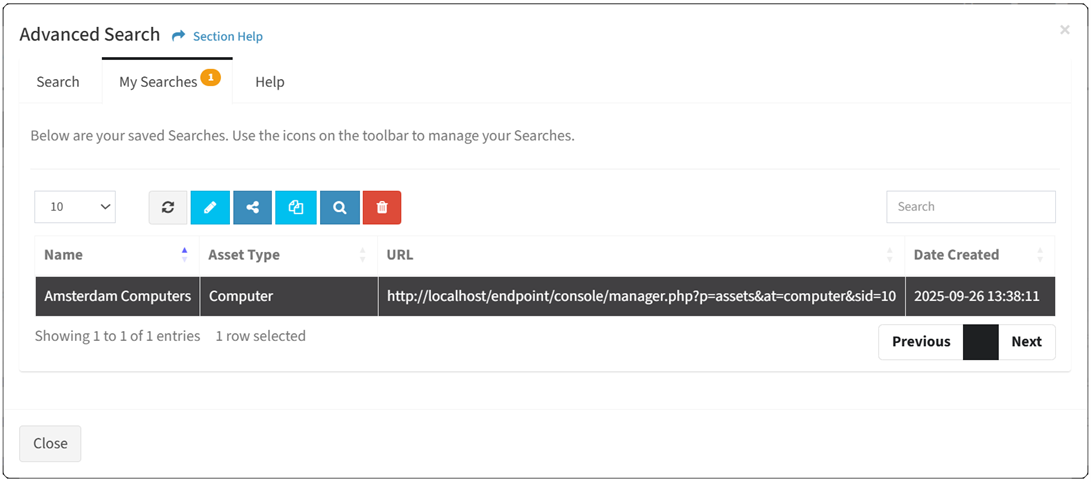 - Delete searches by selecting a search (row) and clicking the Delete button on the toolbar