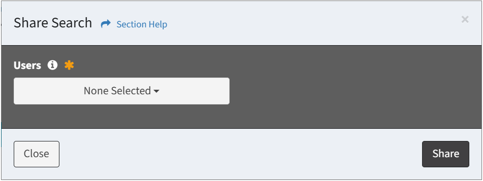 - Select a user from the Users drop down and then click the Share button. You will be redirected back to the My Searches tab. Click the Close button to cancel the operation.