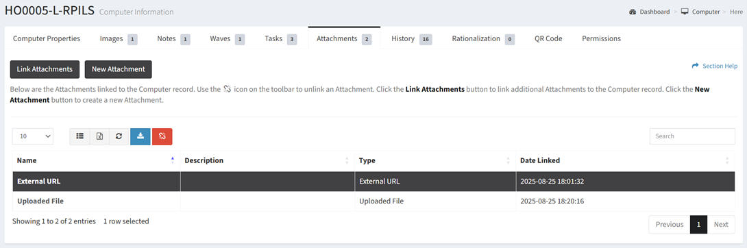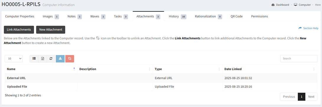 • View the properties of linked attachments by clicking the hyperlink of the Name field