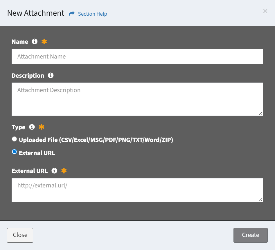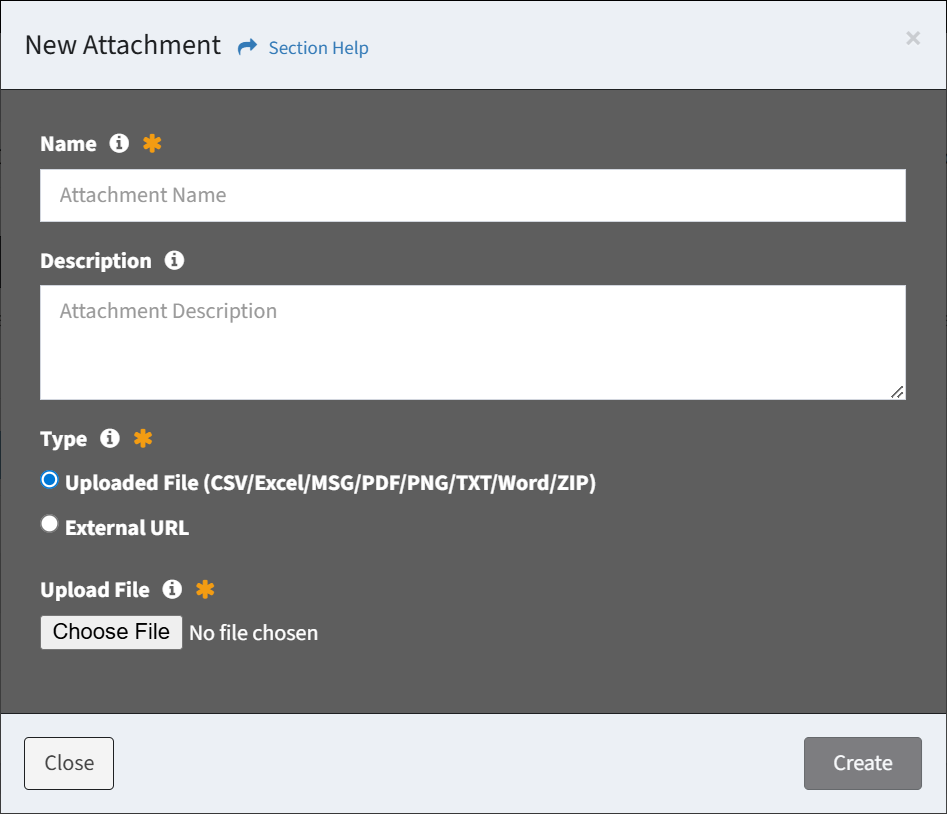 3. Click the Create button when finished to create the attachment. Click the Close button to cancel the operation.