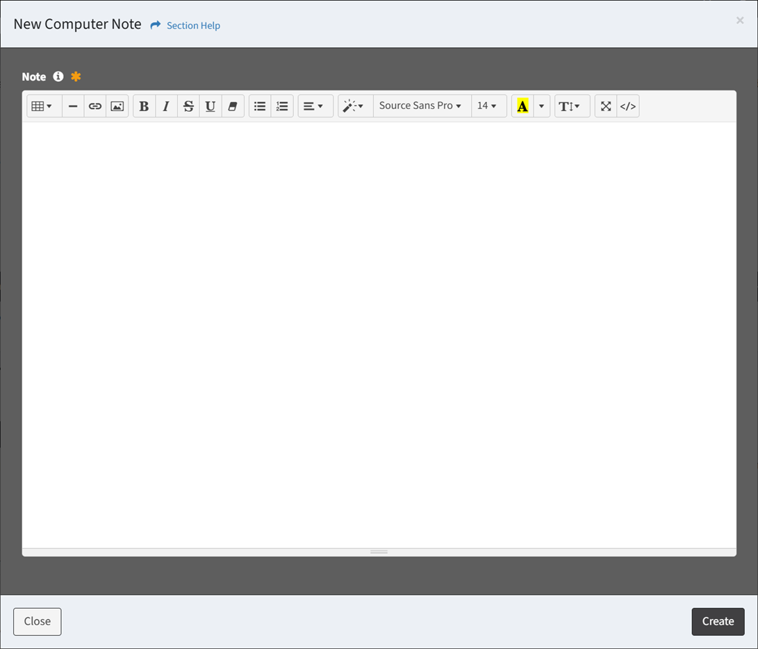 - Enter the note text and click the Create button. Click the Close button to cancel the operation.