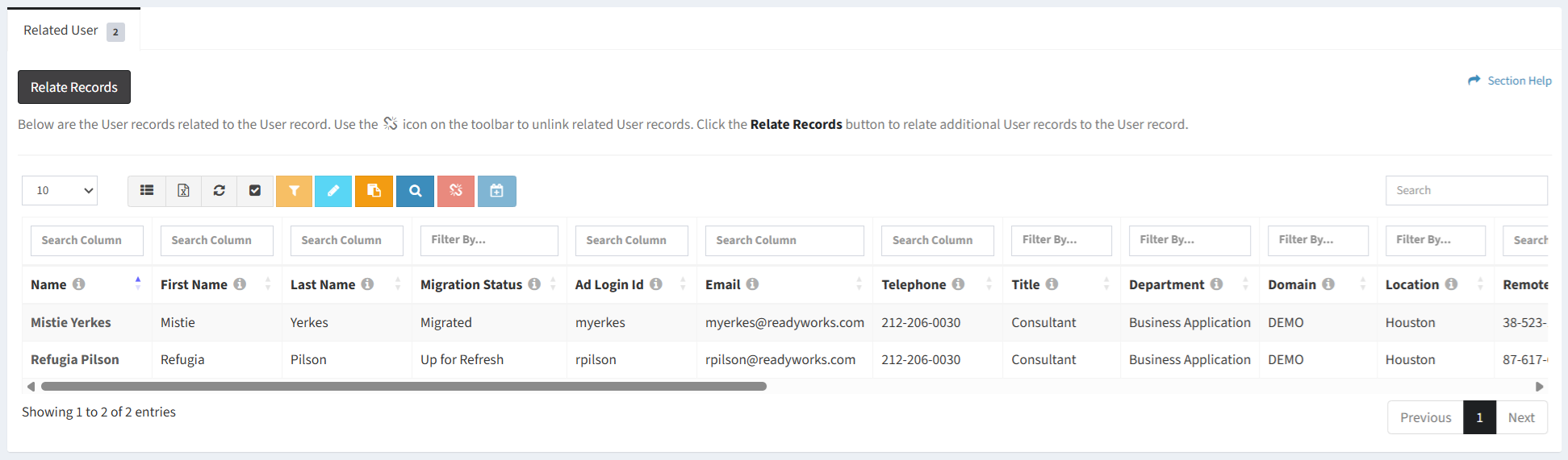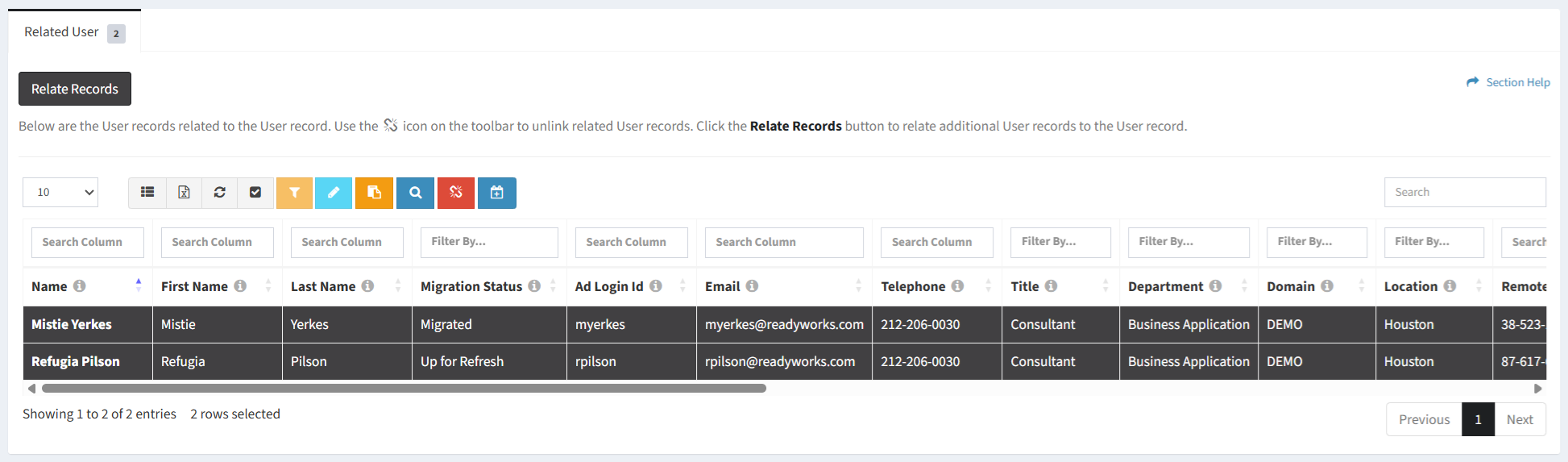 - Unlink related data records from the data record by selecting one or more records (rows) and clicking the Unlink Related Records button on the toolbar