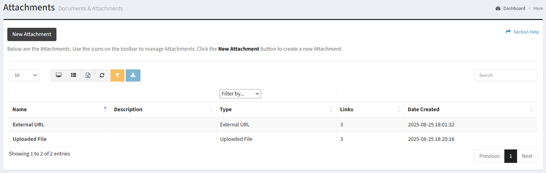 - Type – Type of attachment (Uploaded File or External URL)