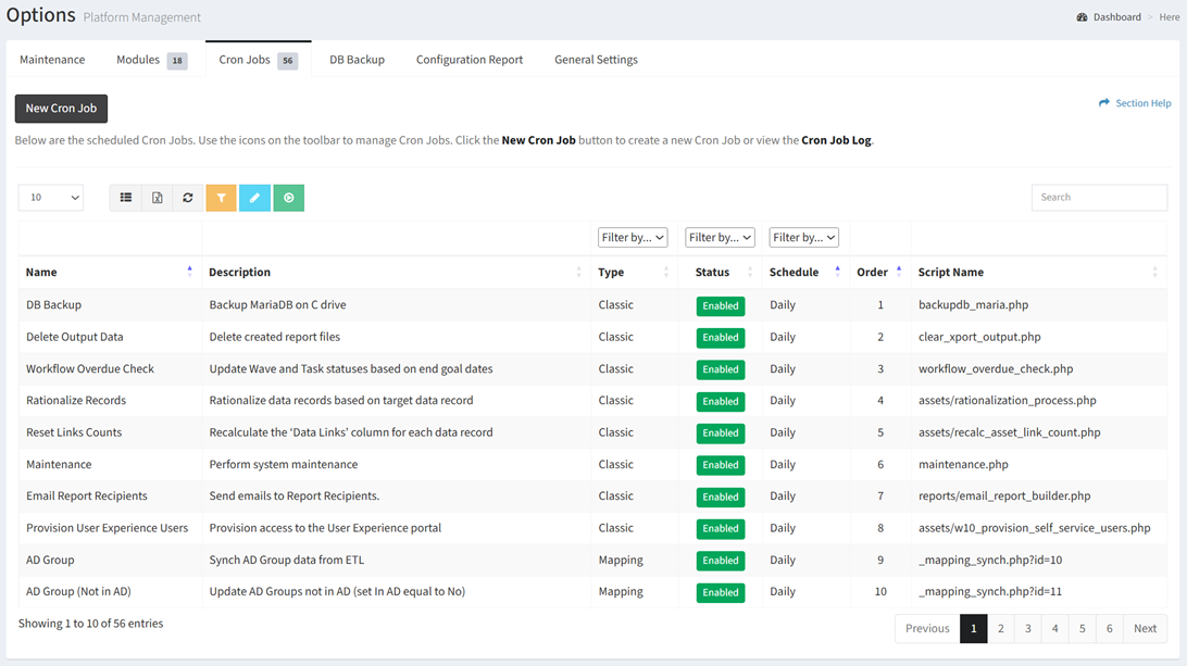 - Edit cron jobs by selecting a cron job (row) and clicking the Edit Cron Job button on the toolbar