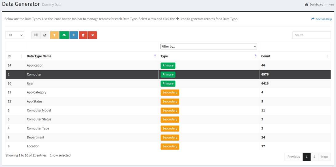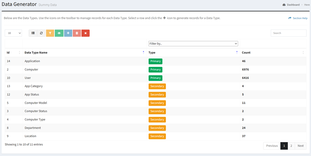 - Generate data records by selecting a data type (row) and clicking the Generate Data button on the toolbar