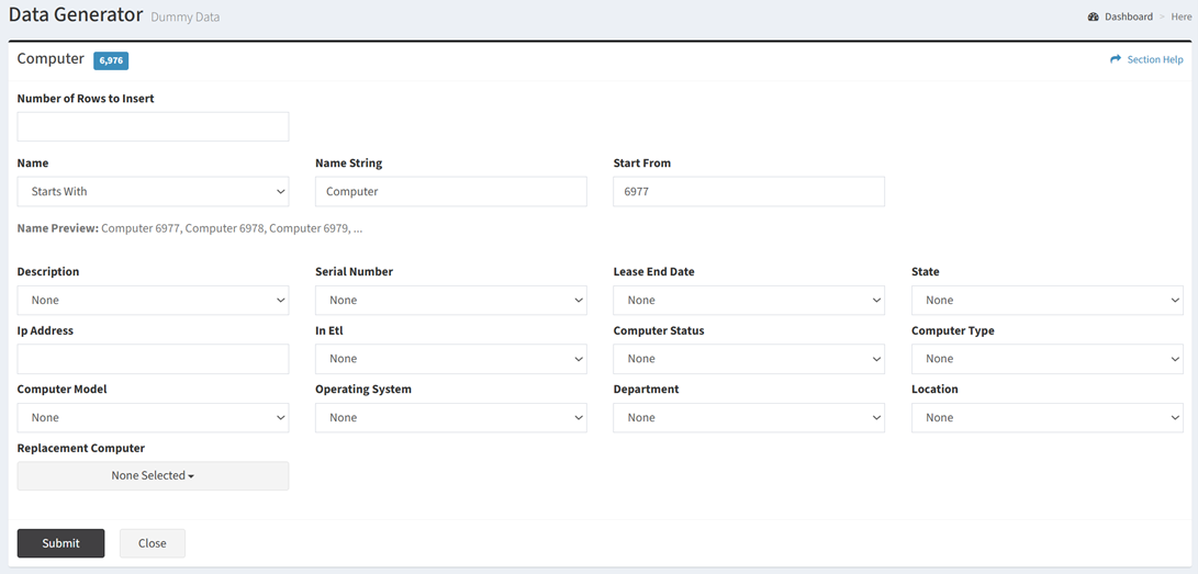 - Click the Submit button to generate data. Click the Close button to cancel the operation.
