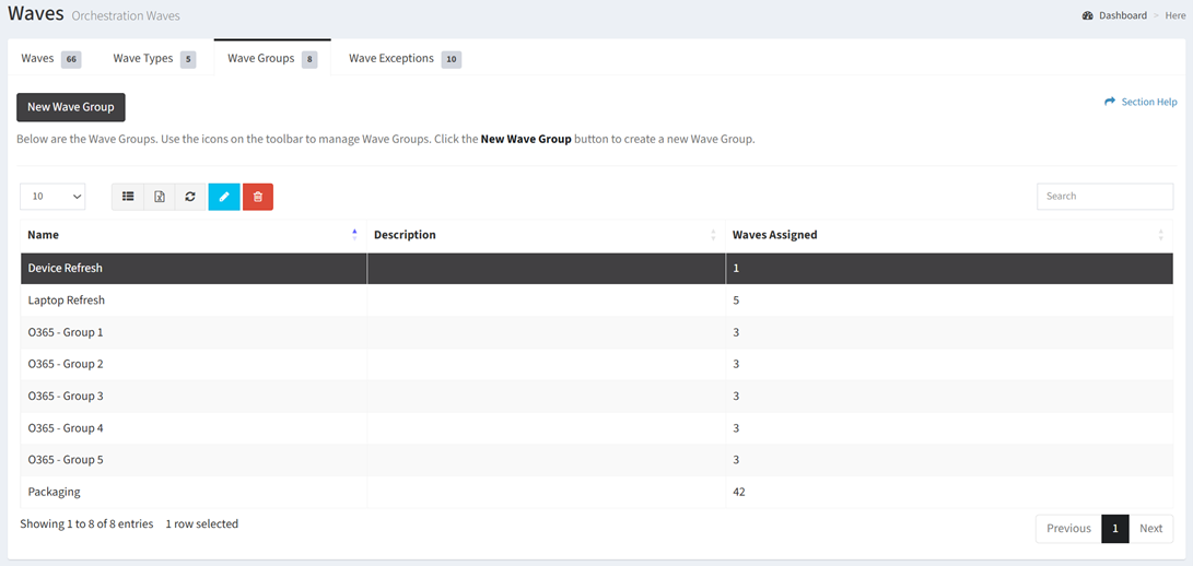 From the Wave Groups tab, you can delete wave groups. To delete: