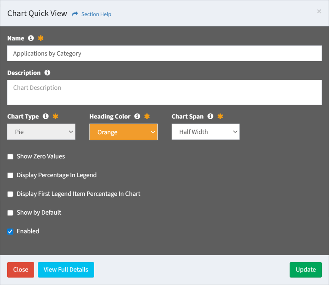 - Click the Update button to save your changes. Click the Close button to cancel the operation. Click the View Full Details button to view all properties for the chart.