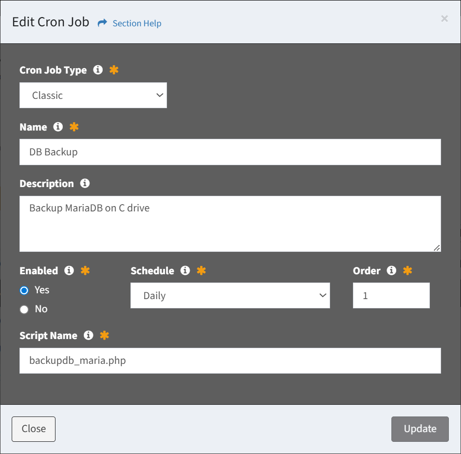 - Click the Update button when finished to update the cron job. Click the Close button to cancel the operation.