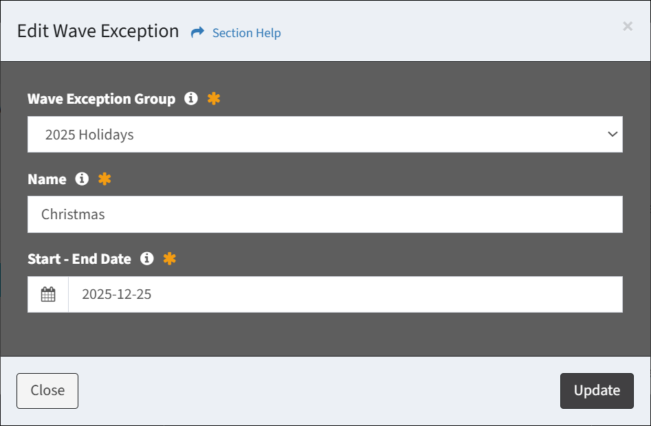 - Click the Update button when finished to update the wave exception. You will be redirected back to the Wave Exceptions tab. Click the Close button to cancel the operation.