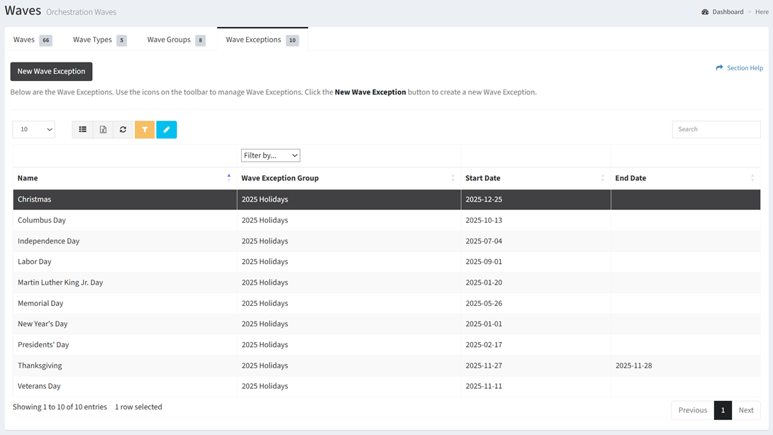 From the Wave Exceptions tab, you can edit wave exceptions. To edit: