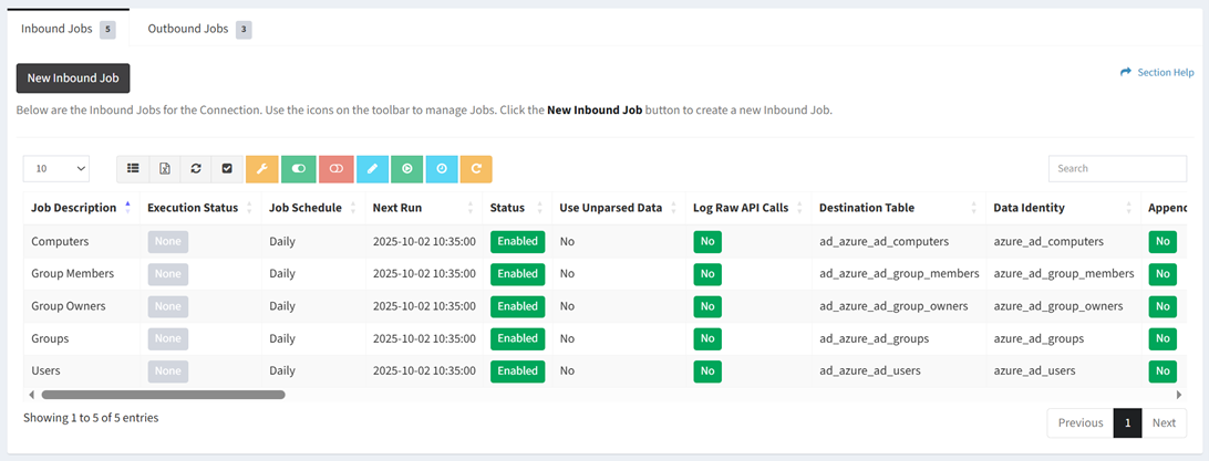 - Enable inbound jobs by selecting one or more jobs (rows) and clicking the Enable Job button on the toolbar
