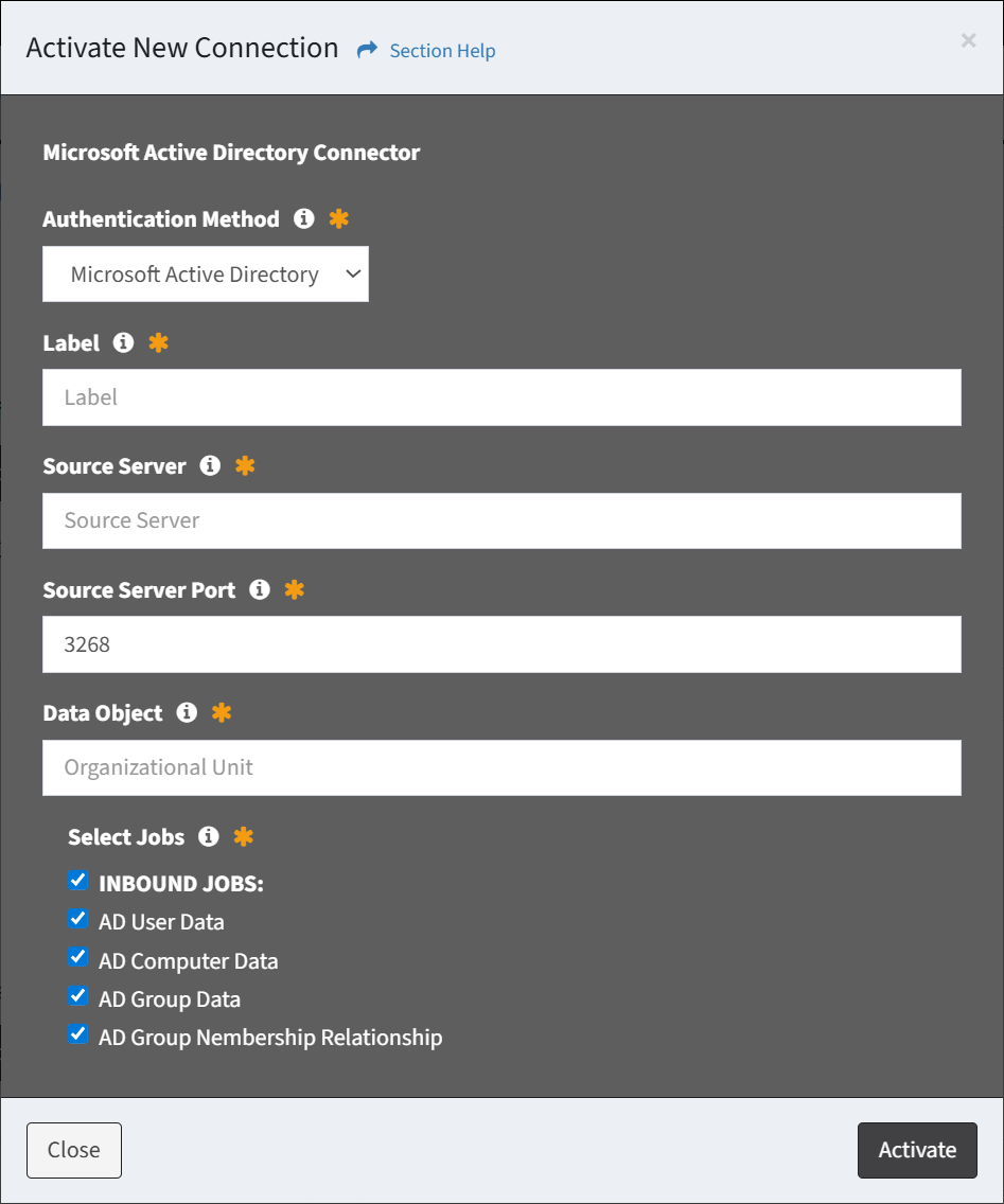 - Click the Activate button when finished to activate the connection. You will be redirected back to the Connections page. Click the Close button to cancel the operation.