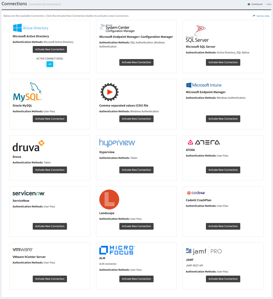 - Activate new connections by clicking on the Activate New Connection button for a given connector