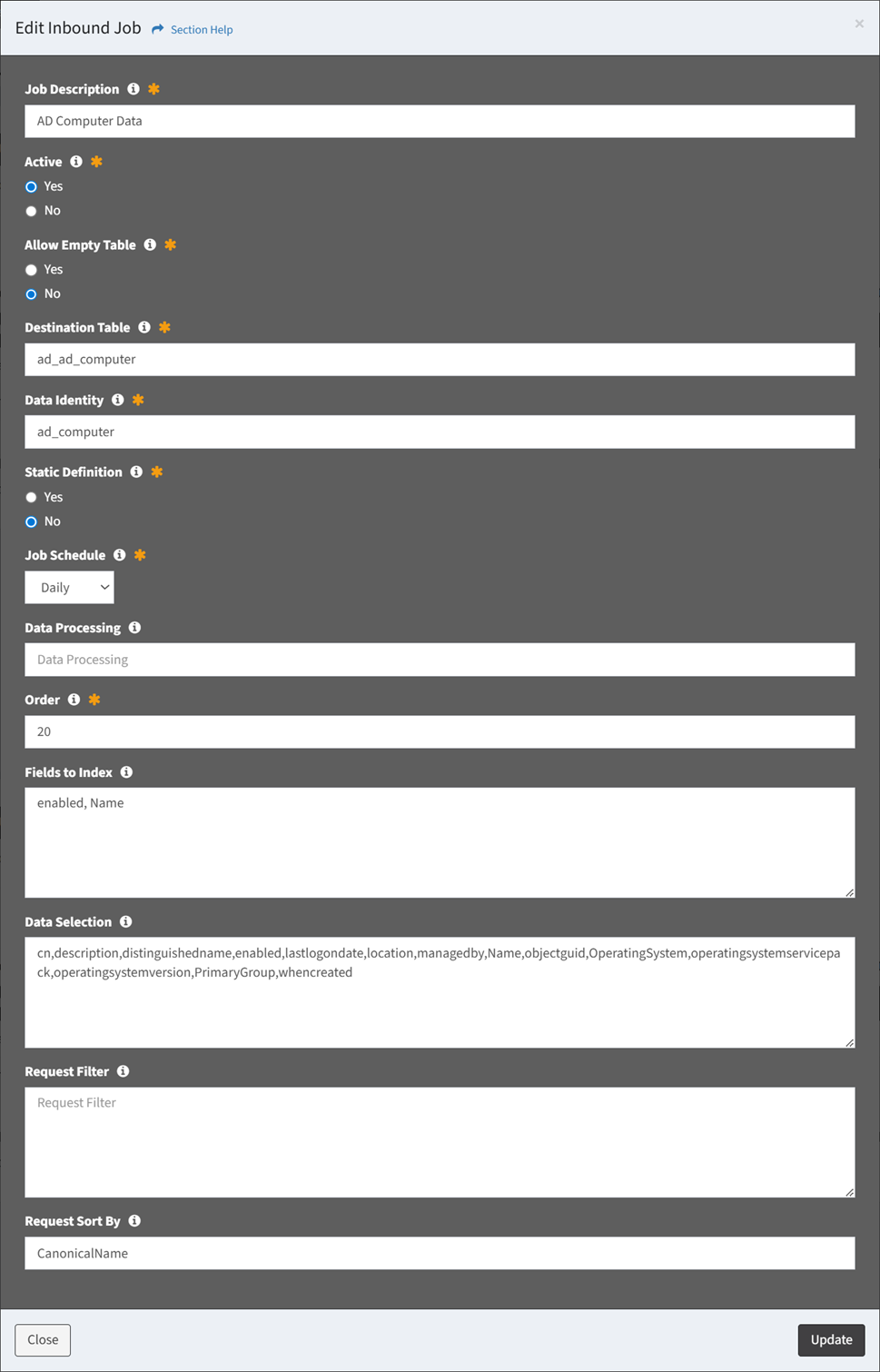 - Click the Update button when finished to update the inbound job. You will be redirected back to the Inbound Jobs tab. Click the Close button to cancel the operation.