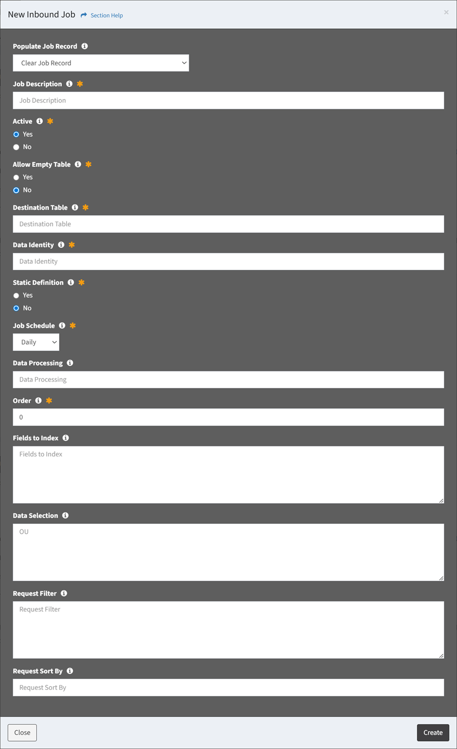 - Click the Create button when finished to create the inbound job. You will be redirected back to the Inbound Jobs tab. Click the Close button to cancel the operation.