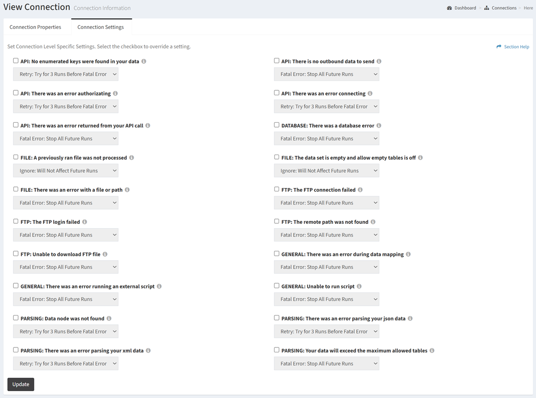 From the Connection Error Settings tab, you can update the connection error settings. To update: