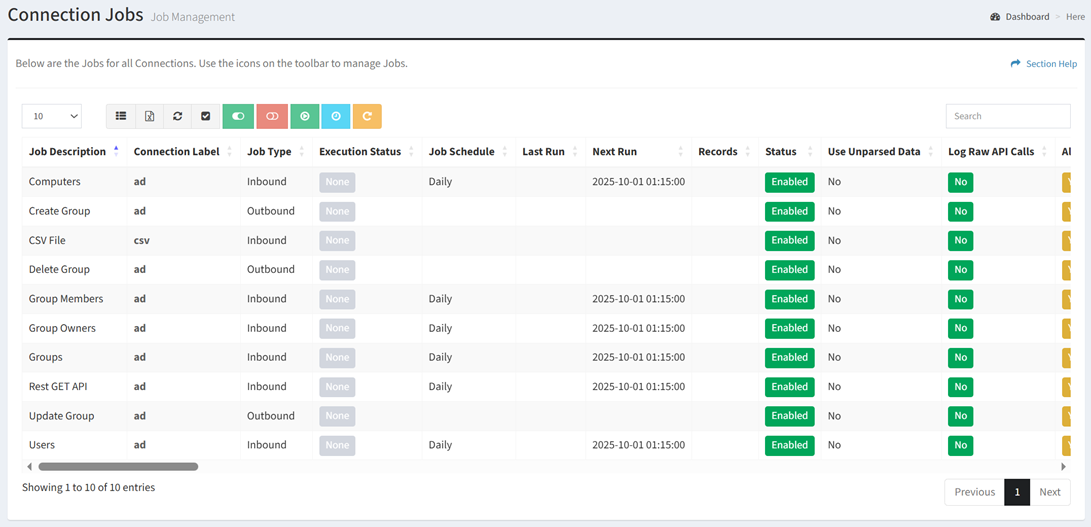 - Enable jobs by selecting one or more jobs (rows) and clicking the Enable Job button on the toolbar