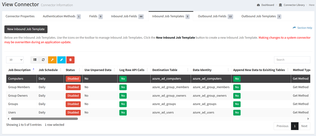 From the Inbound Job Templates tab, you can delete inbound job templates. To delete: