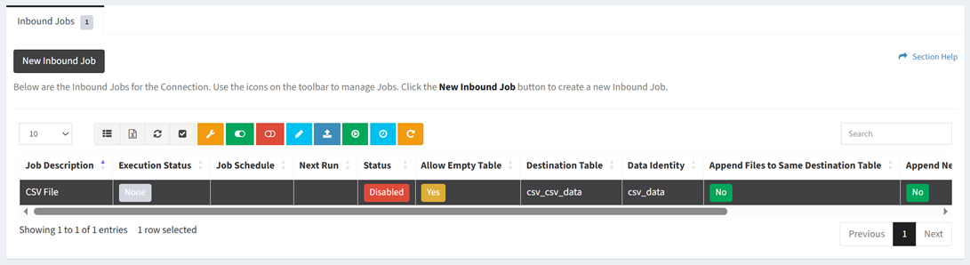 From the Inbound Jobs, Outbound Jobs, and Connection Jobs tabs, you can enable jobs. To enable: