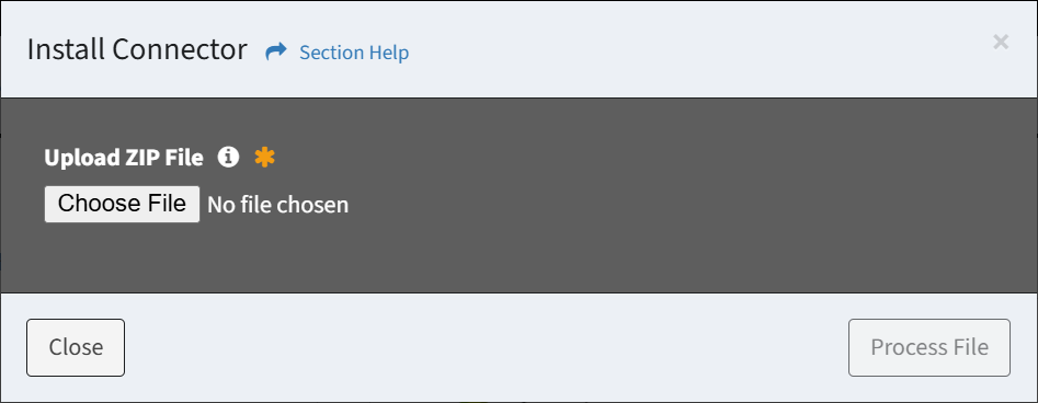 - Browse for the connector source ZIP file to install and click the Process File button to process and install the connector. You will be redirected to the View Connector page. Click the Close button to cancel the operation.