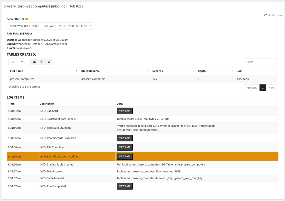 - The execution results are displayed below the job history. Use the Select Run drop down to view the execution results from previous runs.