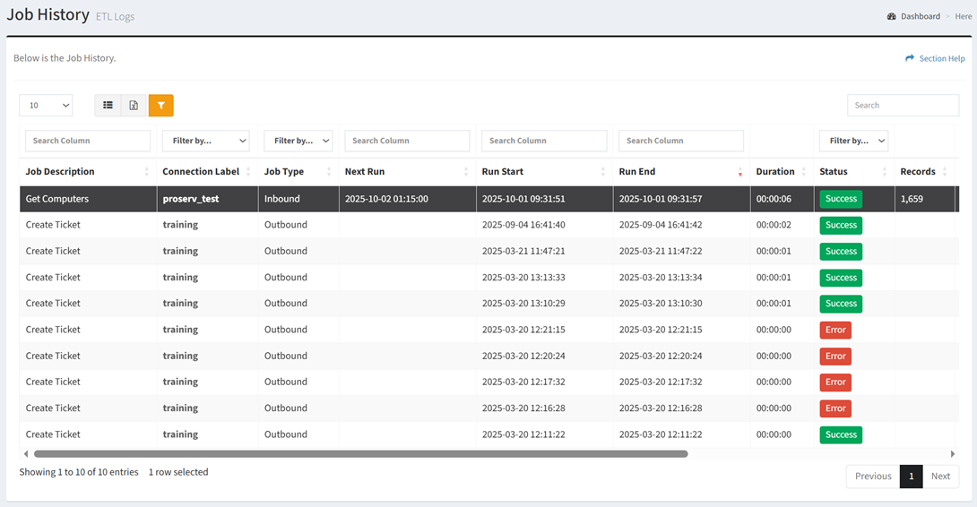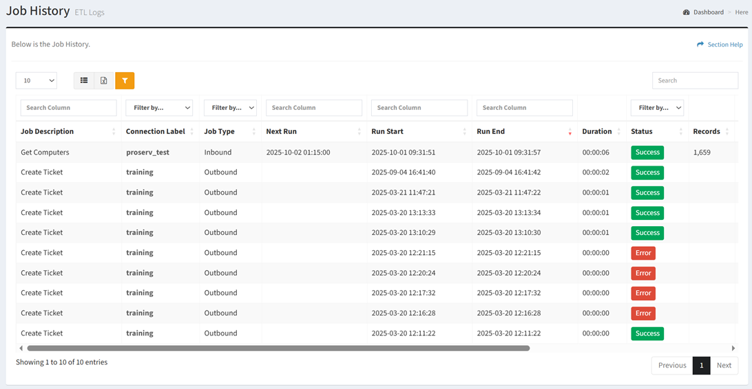 - Has Errors – Whether the job has encountered errors (Yes, No)