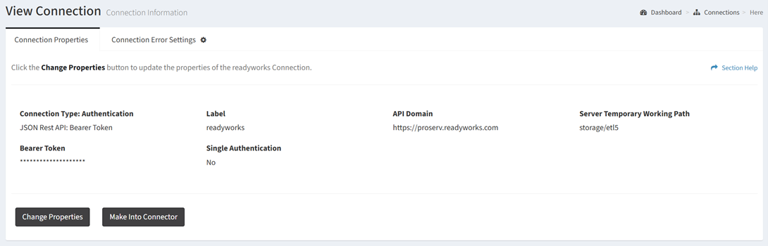 From the Connection Properties tab, you can make connections (as configured) into a new connector. To make into a connector: