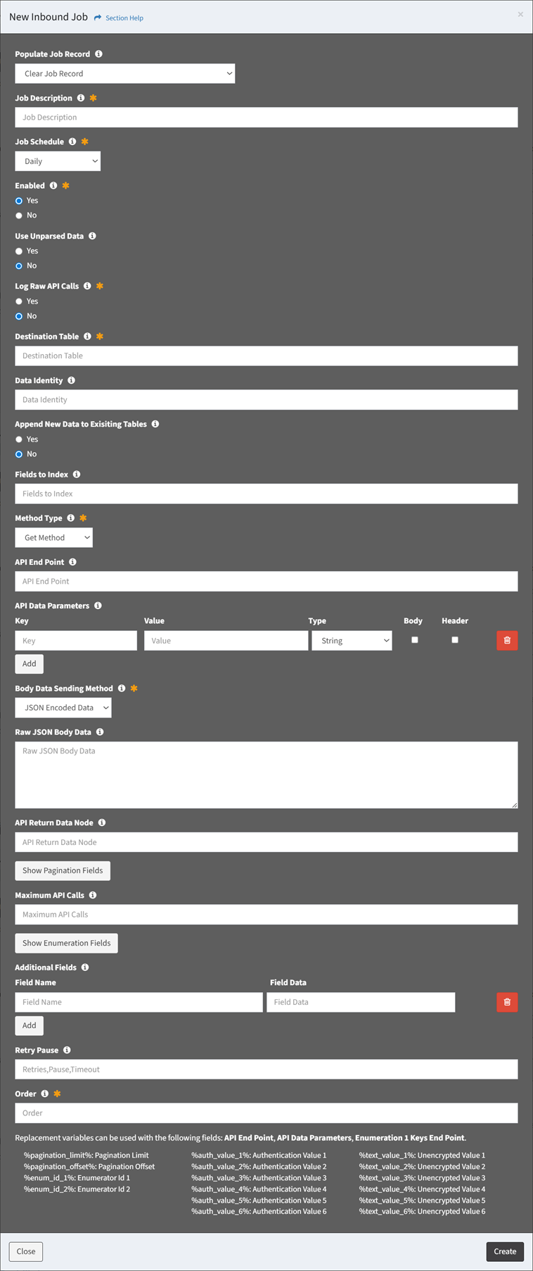 - Click the Create button when finished to create the inbound job. You will be redirected back to the Inbound Jobs tab. Click the Close button to cancel the operation.