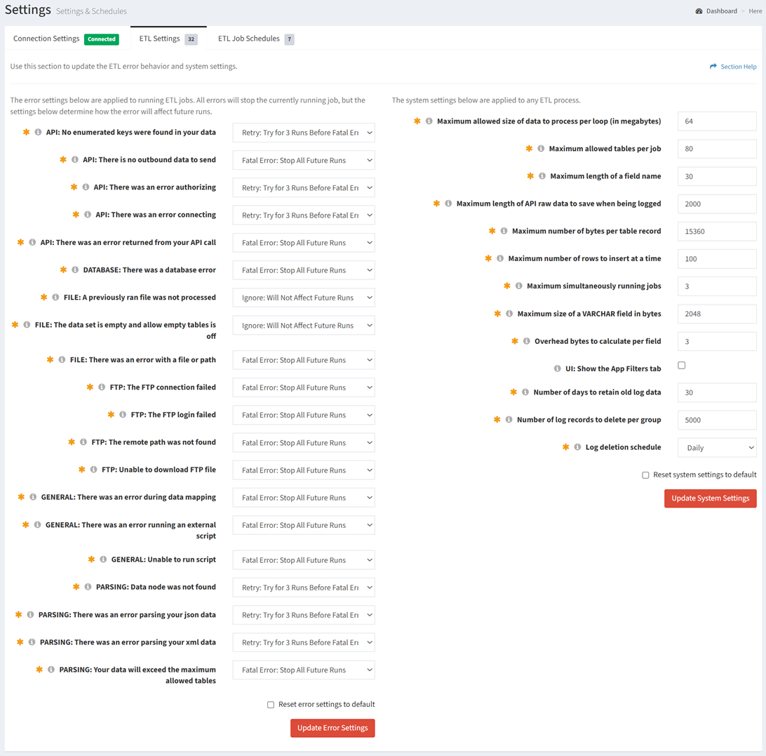 The ETL Settings tab on the Settings page provides the ability to view and configure ETL error and system settings.