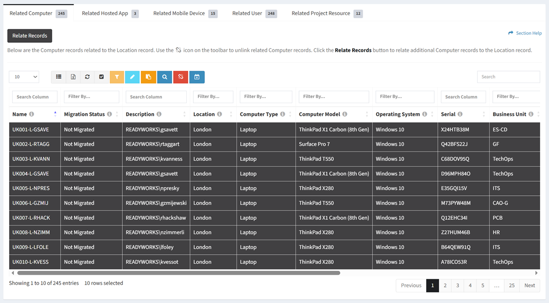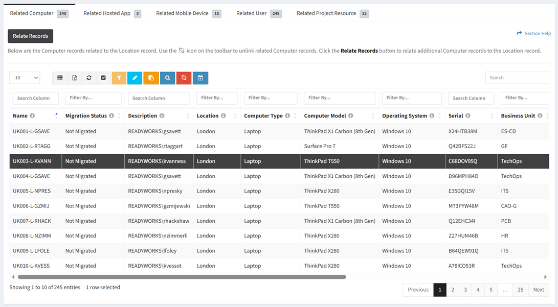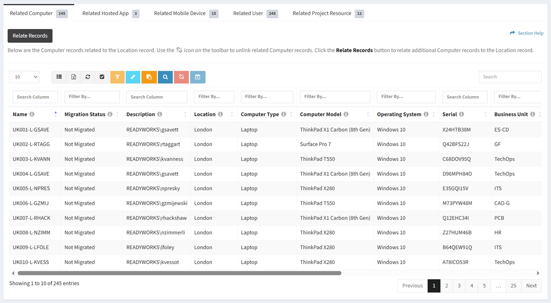 NOTE: Data types (tabs) are not displayed until there is at lease one related data record (e.g., Computers in London). - Columns available depend on what is defined for each data type