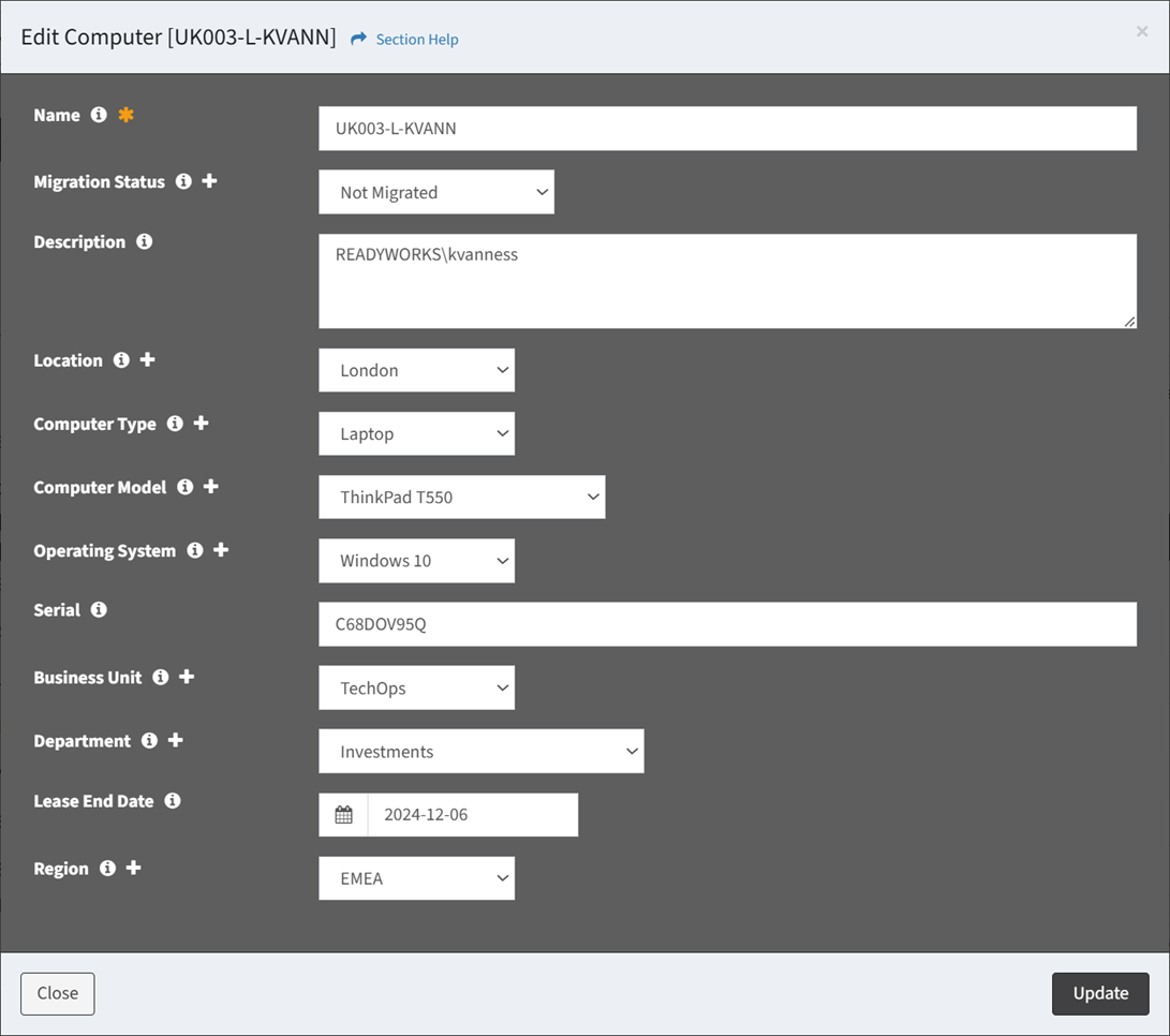 - Click the Update button when finished to update the data record. Click the Close button to cancel the operation.