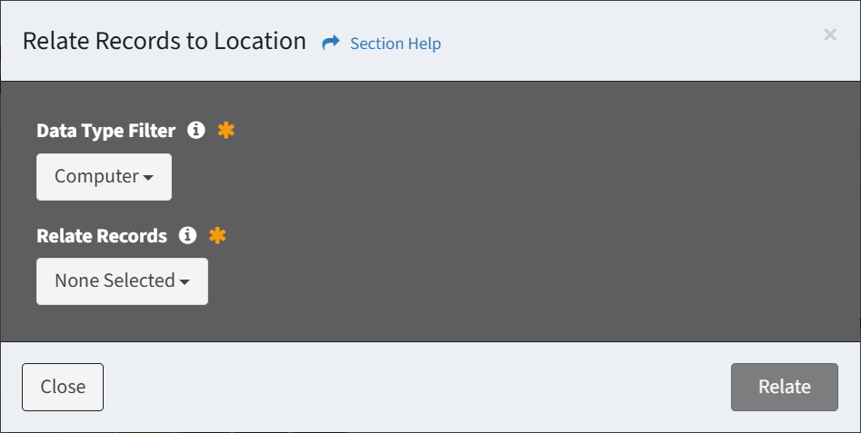 - Select the data type to relate to from the Data Type Filter drop down, select the column to relate to from the Relate Records to Column drop down (not shown), select data records from the Relate Records drop down and then click the Relate button. Click the Close button to cancel the operation. If there are alias columns on the related data record, multiple selections may be available from the Relate Records to Column drop down (not shown).