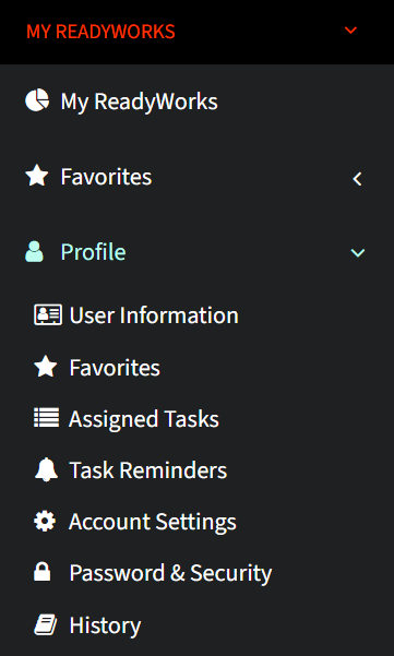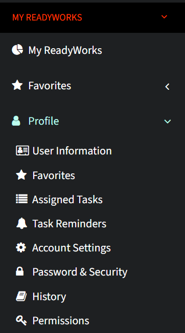 The Profile folder under the My ReadyWorks section on the Navigation Menu provides the ability to view the properties of your user account and is accessed by expanding the Profile folder and clicking any of the hyperlinks.