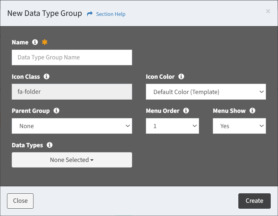 - Click the Create button when finished to create the data type group. You will be redirected back to the Data Type Groups tab. Click the Close button to cancel the operation.