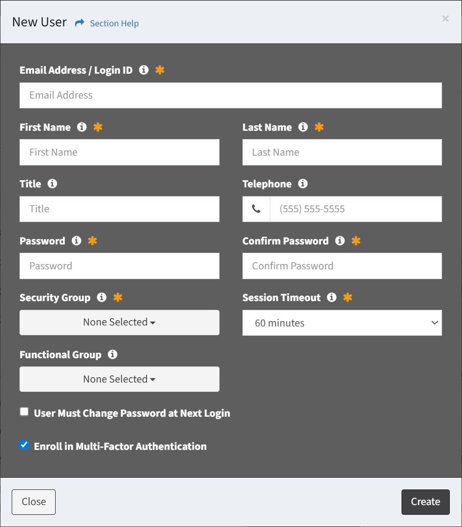 3. Click the Create button when finished to create the user account. You will be redirected back to the User Accounts tab. Click the Close button to cancel the operation.
