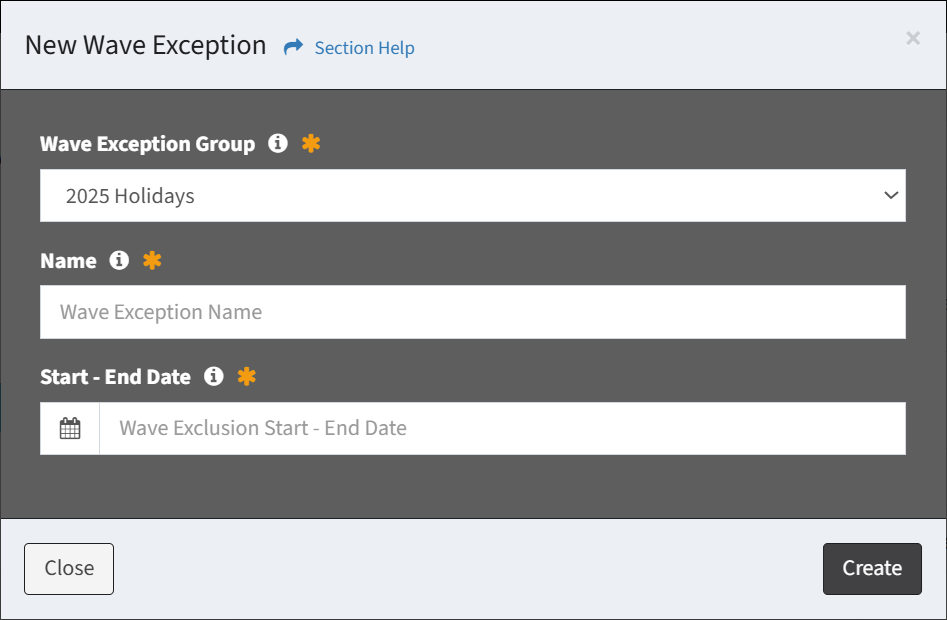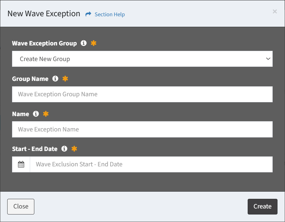 - Click the Create button when finished to create the wave exception. You will be redirected back to the Wave Exceptions tab. Click the Close button to cancel the operation.