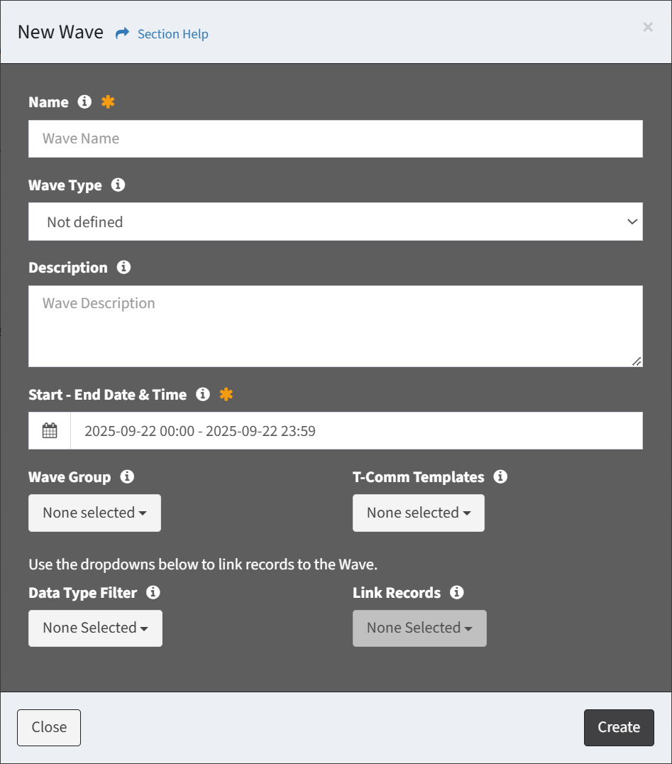 - T-Comm Templates – Select T-Comm Templates from the drop down to link to the wave (optional)