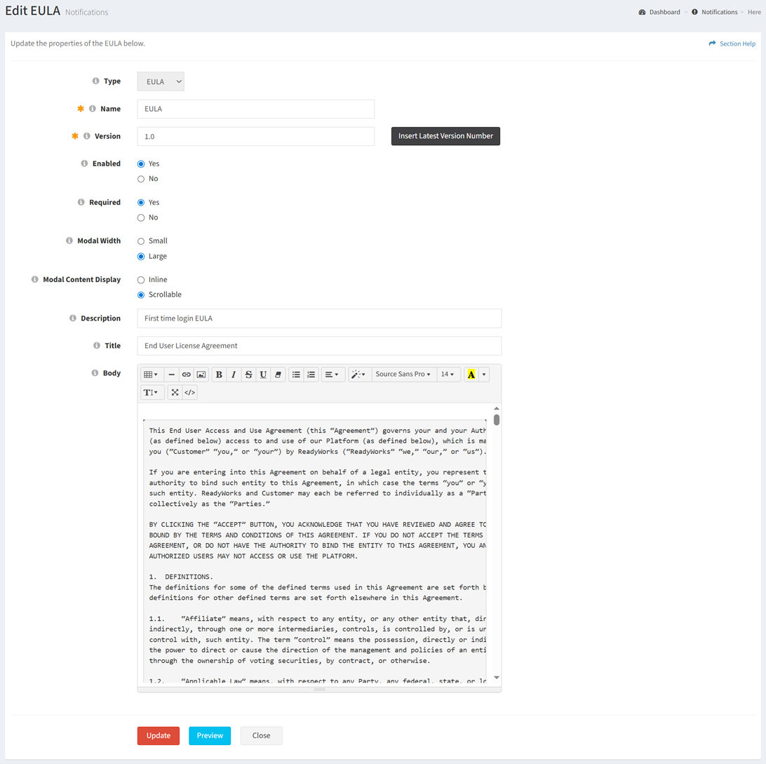 - Click the Update button when finished to update the notification. You will be redirected back to the Notifications page. Click the Close button to cancel the operation.