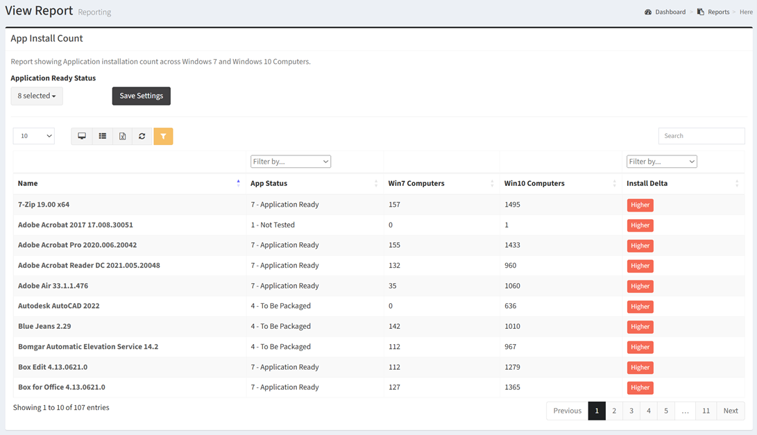 - View a list of applications by install counts by operating system (Windows 7 and Windows 10)