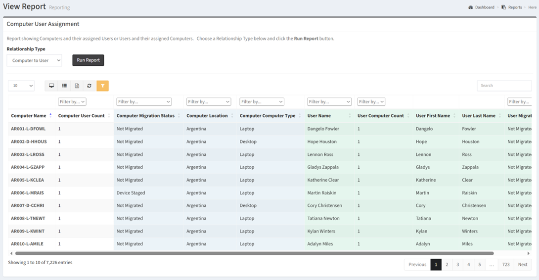 The Computer User Assignment report shows Computers and their assigned Users or Users and their assigned Computers.