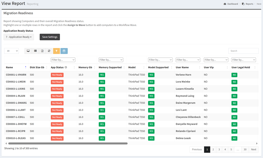 The Migration Readiness (Complex) report shows Windows Computers and their overall Migration Readiness status.