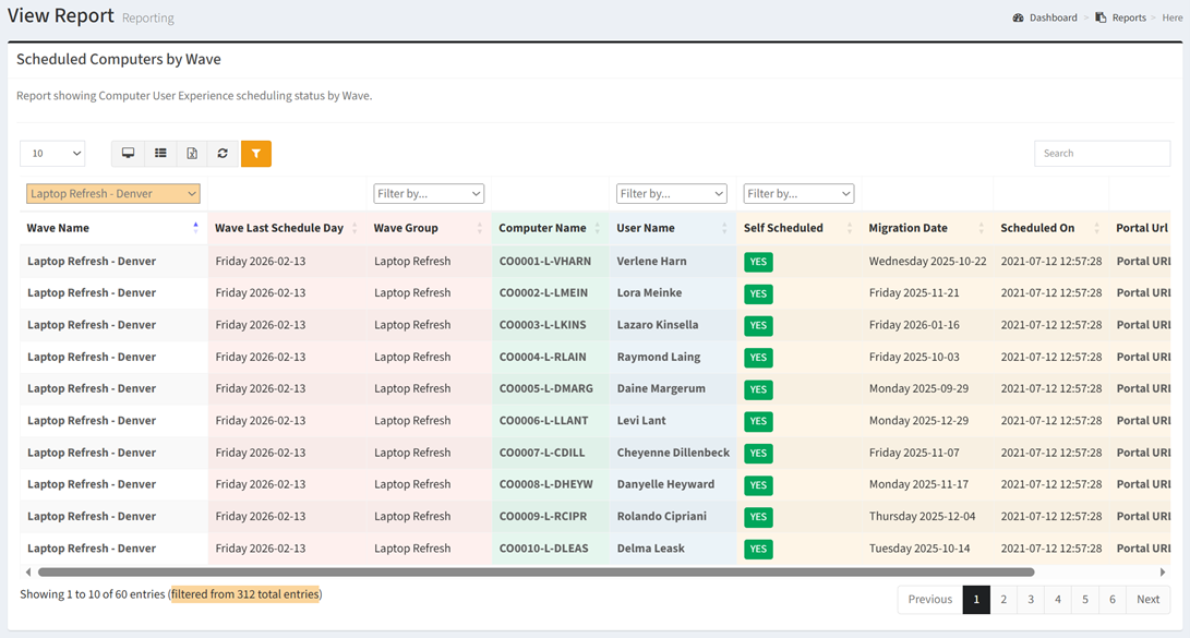 The Scheduled Computers by Wave report shows Computer User Experience scheduling status by Wave.