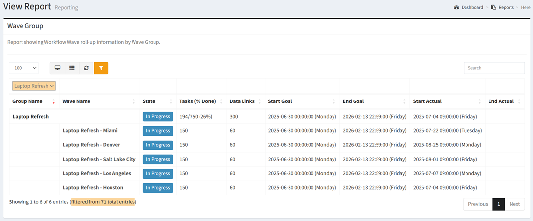- State – Status of the wave (Not Started, In Progress, Complete, Delayed, Failed)
