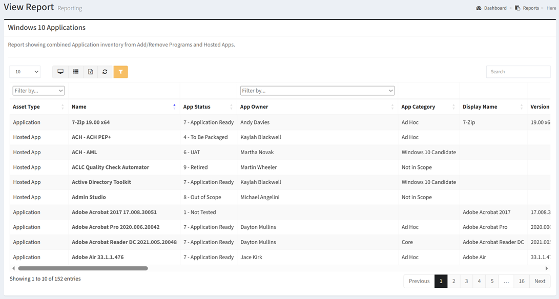 The Windows 10 Applications report shows combined Application inventory from Add/Remove Programs and Hosted Apps.