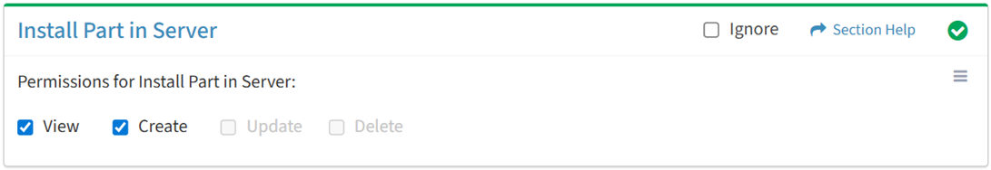 From the Install Part in Server tab, you can ignore install part in server permissions from this security group by selecting Ignore. This option is used when overlaying multiple security groups and install part in server permissions are set by a different security group. Not enabling permissions on the Install Part in Server tab, without selecting Ignore, results in no access, as overlaid security groups assume the most restrictive permissions.