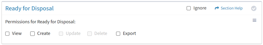 From the Ready for Disposal tab, you can ignore ready for disposal permissions from this security group by selecting Ignore. This option is used when overlaying multiple security groups and ready for disposal permissions are set by a different security group. Not enabling permissions on the Ready for Disposal tab, without selecting Ignore, results in no access, as overlaid security groups assume the most restrictive permissions.