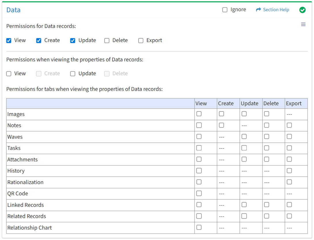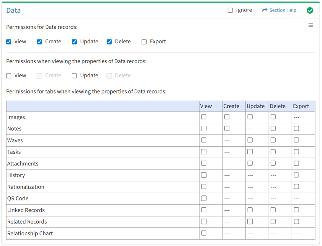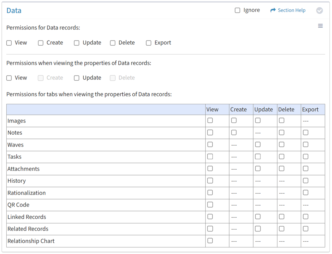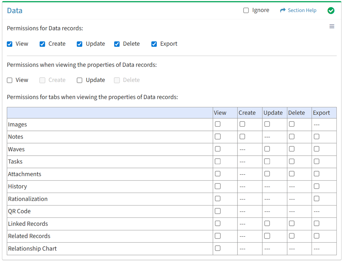 From the Data tab, you can ignore data permissions from this security group by selecting Ignore. This option is used when overlaying multiple security groups and data permissions are set by a different security group. Not enabling permissions on the Data tab, without selecting Ignore, results in no access, as overlaid security groups assume the most restrictive permissions.